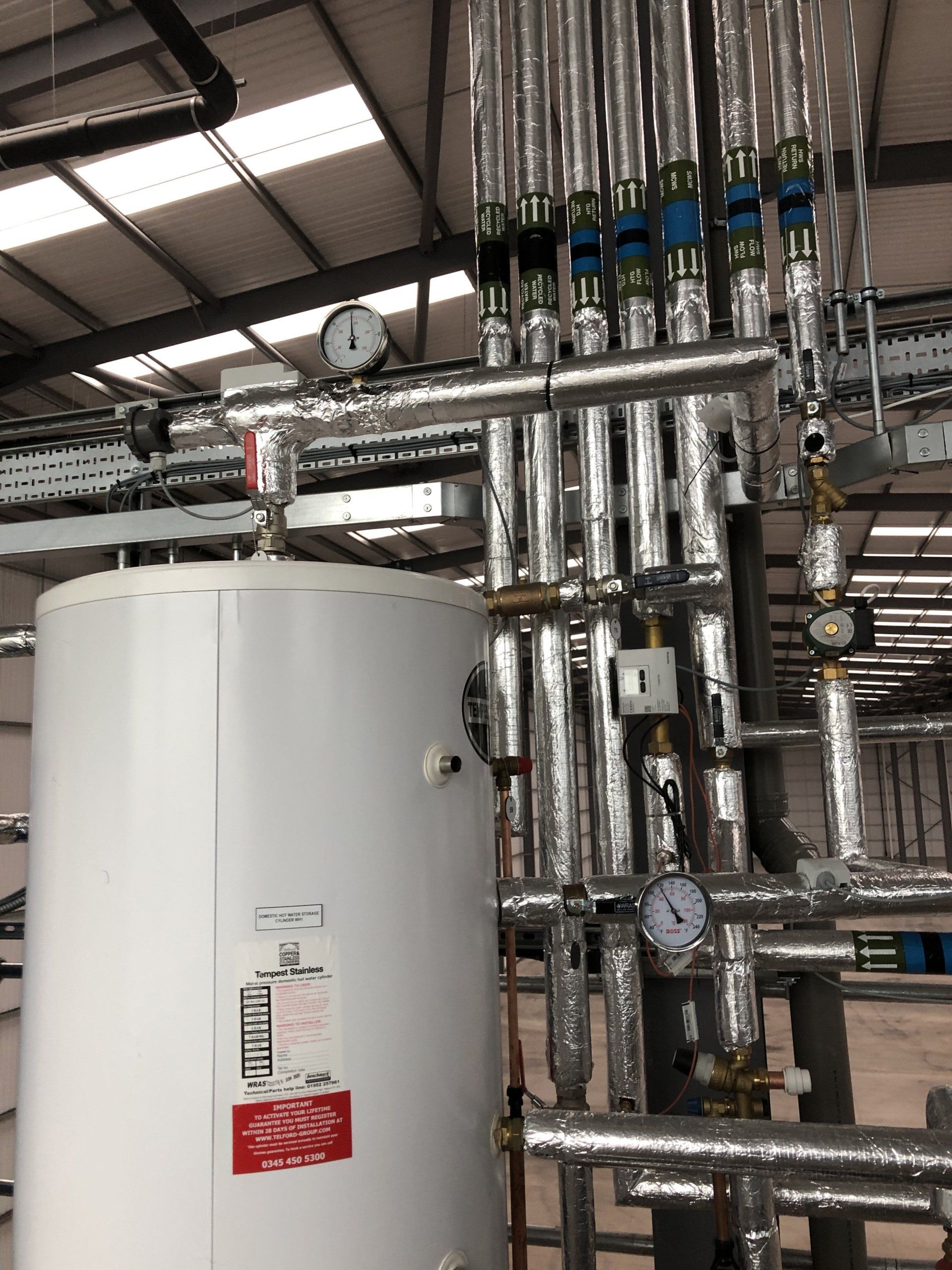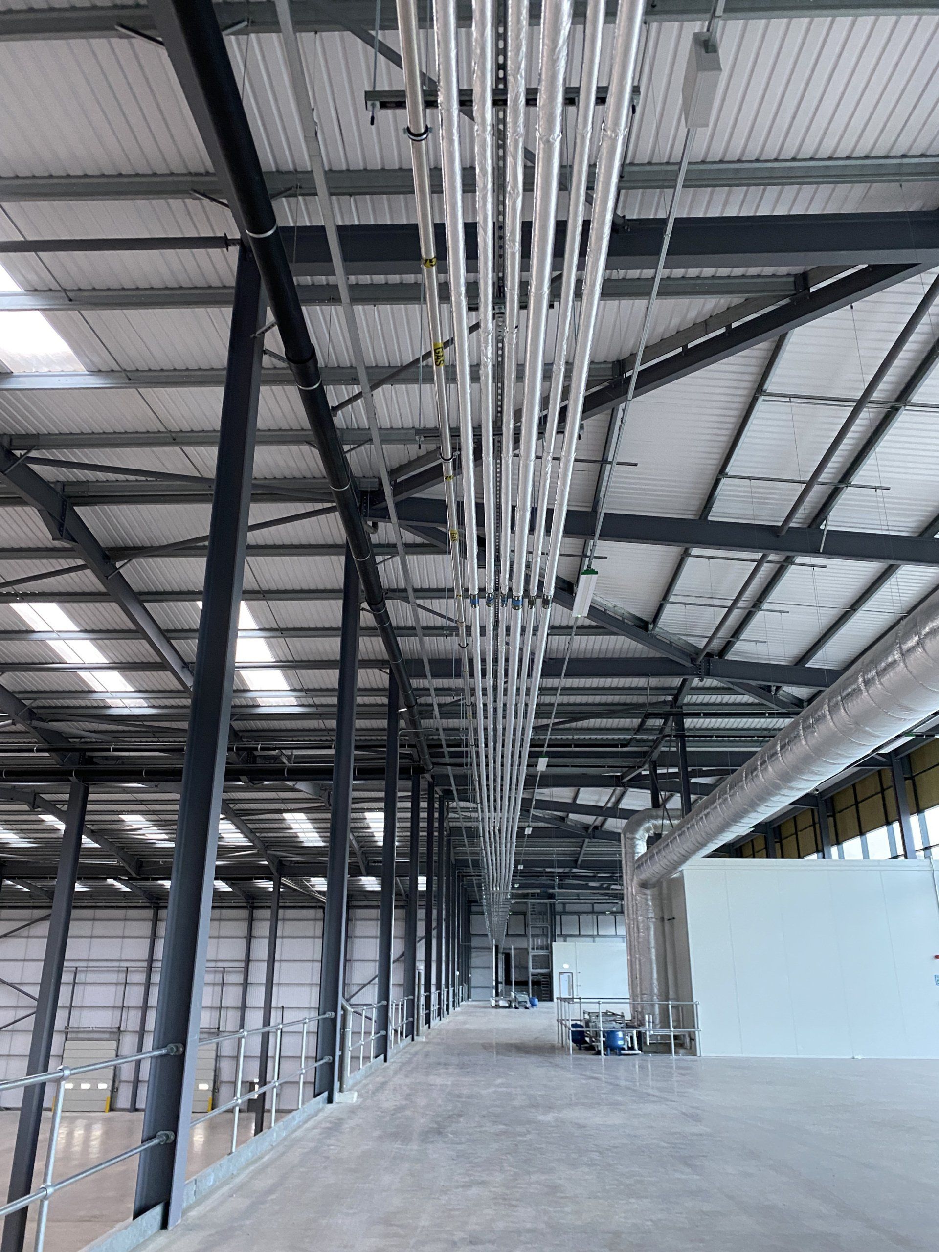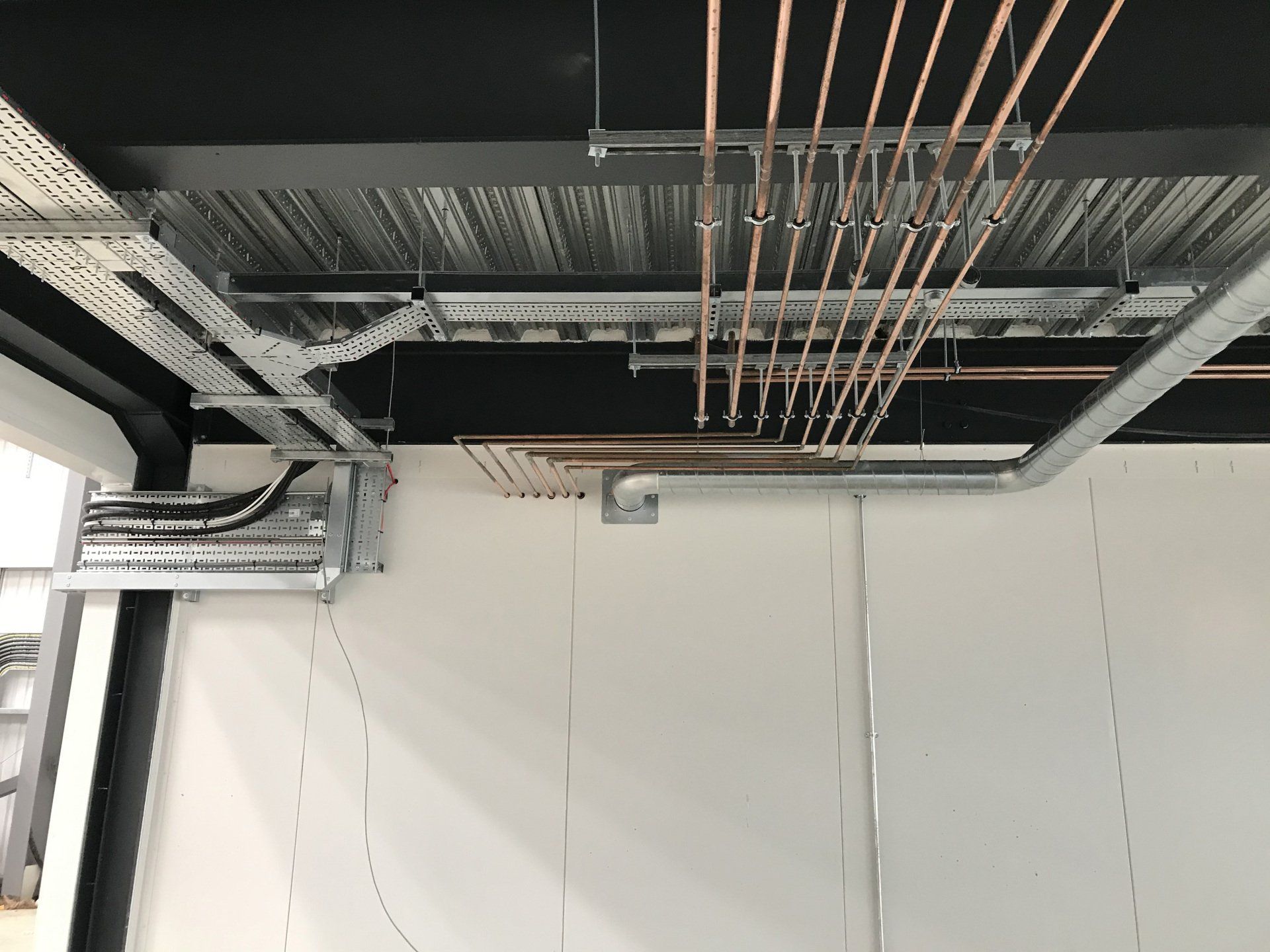 The project consisted of two new warehouses with office spaces fitted out to CAT A standard achieving BREEAM Excellent status. Services included 1.5MVA incoming HV, mains electrical distribution, internal and external lighting including digital lighting systems, fire alarm, disabled alarm, car charging points and lightning protection. External fire hydrant ring mains, external and internal gas supplies, gas fired LPHW heating system, hybrid VRF comfort cooling and heating, rainwater harvesting system serving WCs and external irrigation points, sanitary ware and above ground drainage. Domestic hot and cold water including solar thermal systems. Mechanical ventilation via central air handling units and twin extract fans. Trend BMS controls systems.